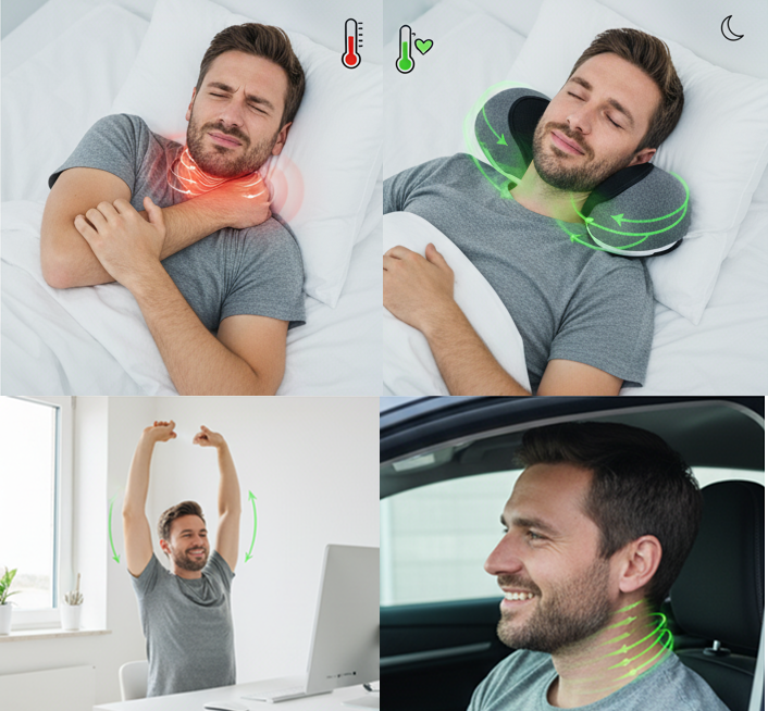 De warmte en hoek samen ontspannen de nek en verbeteren de bloedcirculatie.