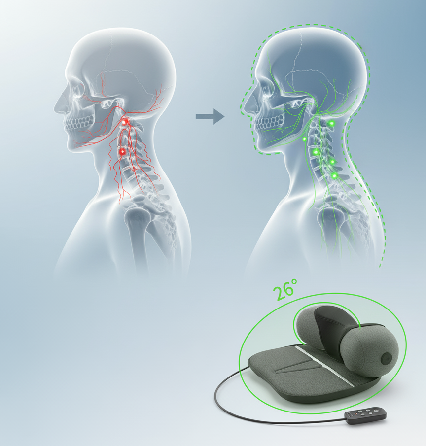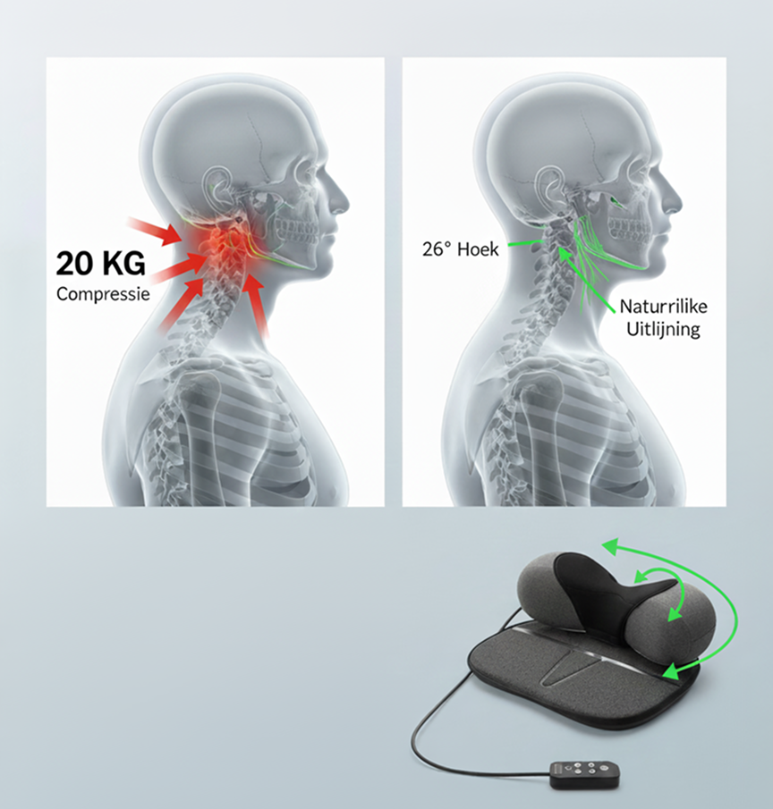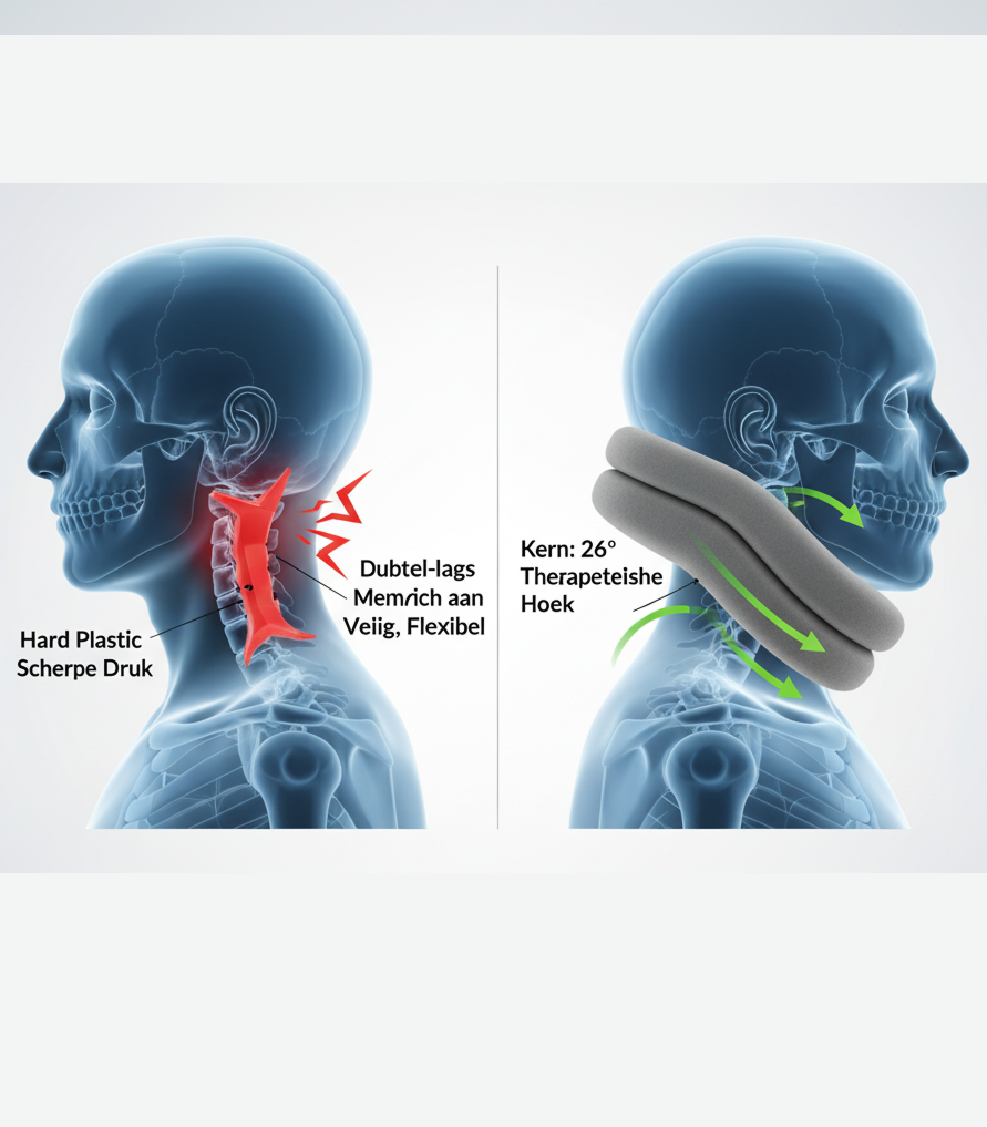 Het kussen heft je nekwervels met een precieze 26°-hoek, identiek aan klinische manuele therapie.