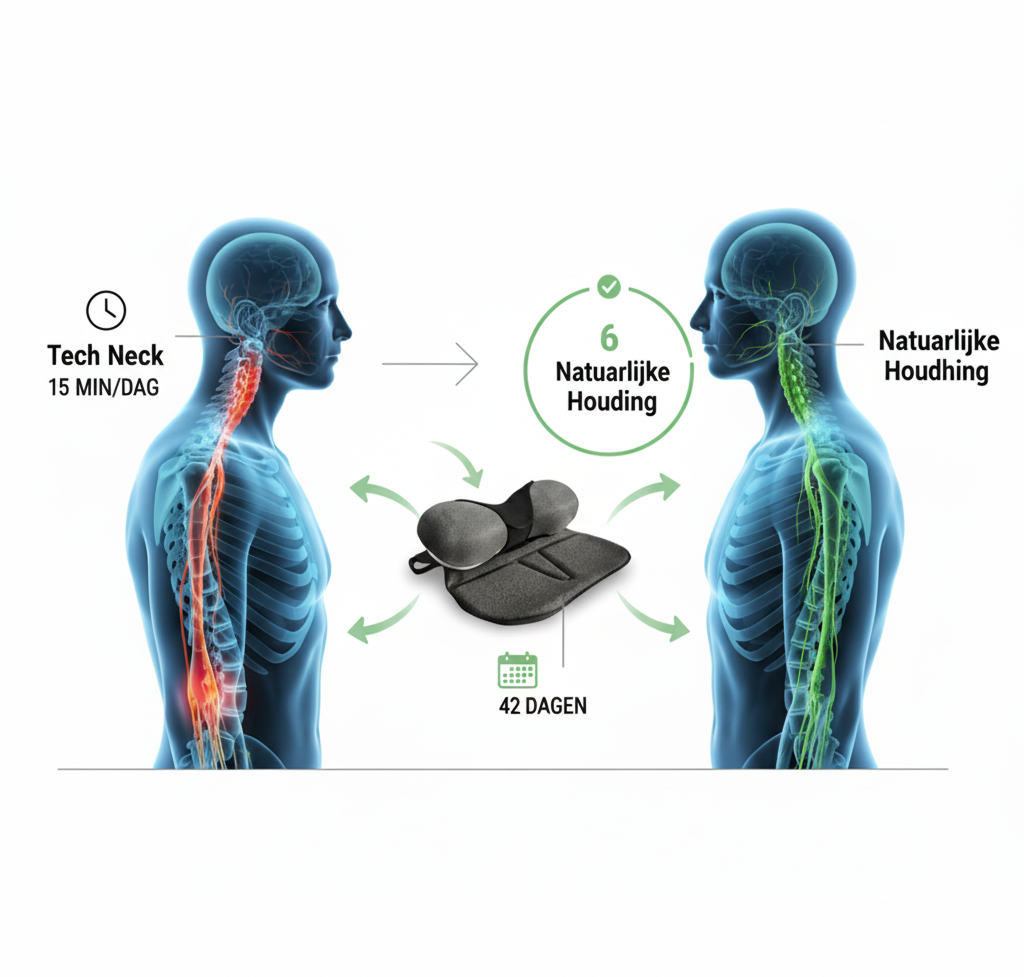 Bij langdurig schermwerk weegt je hoofd niet 5 maar 20 kilo — en dat voel je.